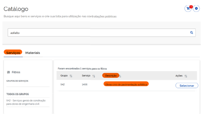 - Para serviços e obras: A DESCRIÇÃO DOS SERVIÇOS OU OBRAS vinculada a grupos específicos e identificada por códigos próprios