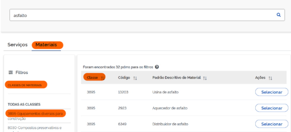 - Para materiais: A CLASSE DO MATERIAL identificada por código numérico e descrição padronizada no Padrão Descritivo de Materiais