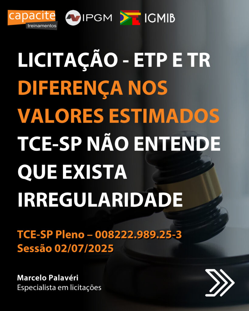 Licitação – ETP e TR diferença nos valores estimados TCE-SP não entende que exista irregularidade TCE-SP – Pleno – Sessão de 02/07/2025 – Processo 008222.989.25-3 “[…] não há, necessariamente, a obrigatoriedade de coincidência da estimativa da contratação entre o ETP e o Termo de Referência. Isto porque, enquanto aquele (o ETP) baseia-se, em regra, […]